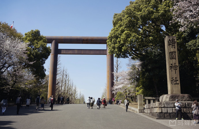 甬道二旁排列着大、中、小的石灯笼。人不是很多,但也不少,络绎不绝。我顺着长长的甬道,来到“鸟居”(日式牌楼)。 日本人来参拜神社,进“鸟居”要躹躬,出“鸟居”要躹躬。咱是中国人,不可能向小鬼子躹躬。日本的神社、寺庙往往都在入口处设有“手水所”。何谓“手水所”?就是装满清水的水池。在清洗池边放几个可爱的小木瓢。以惯用手拿起水瓢舀水,倒在另一只手的手掌中,喝水、漱口或清洗。把自己的手脸洗干净,才好去拜神、拜佛。最后用水瓢中剩余的水沿着木瓢往下倒,把自己用手拿过的地方也洗一洗,以方便下一个人使用,这样才文明礼貌。 靖国神社有数个出入口,大的出入口有大“手水所”,小的出入口有小“手水所”。大门很大,很是气派,从木质看,大门应该也是用台湾阿里山神木建造。我摸着中国阿里山神木大门拍照留影,心中颇有一番感触哟!你知道建造这“鸟居”和大门的木材来自哪里吗?你去台湾阿里山乘坐过小火车吗?你以为那是为了旅游而建的小火车?错!大错特错!那是日本鬼子为了抢劫中国台湾阿里山神木,为了将木材快速外运所建设的专用铁路。整个台湾阿里山约300万立方米的神木被洗劫一空,被掠夺到日本。靖国神社(含日本所有神社)大门前的神木,百分之百都来自中国台湾阿里山。台湾阿里山只剩下漏网之鱼的几根神木,供大陆游人参观。 进入大门,左边有二栋建筑,右边有个大戏台。建在宽阔空地上让人看戏的戏台,与中国许许多多的乡村戏台有得一拼。戏台上正在上演日本,音乐声、伊伊呀呀声不断传过来。台下有座位,大约有几十个观众。 道路正前面就是靖国神社正殿,我不想在其正面留影,选择在其右侧面拍照。