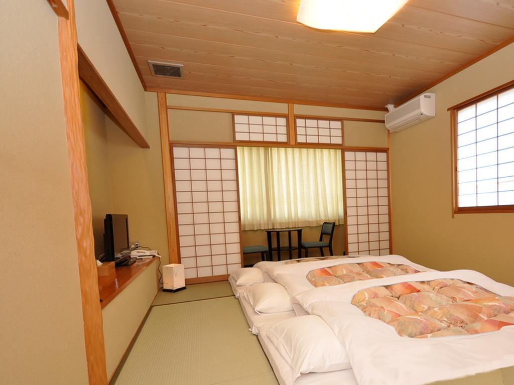 空调客房的榻榻米(草编)地板上铺有传统的蒲团寝具,供客人就寝时使用。此外,房内还配有液晶电视、连接浴室、日式浴衣,并提供洗浴用品。
