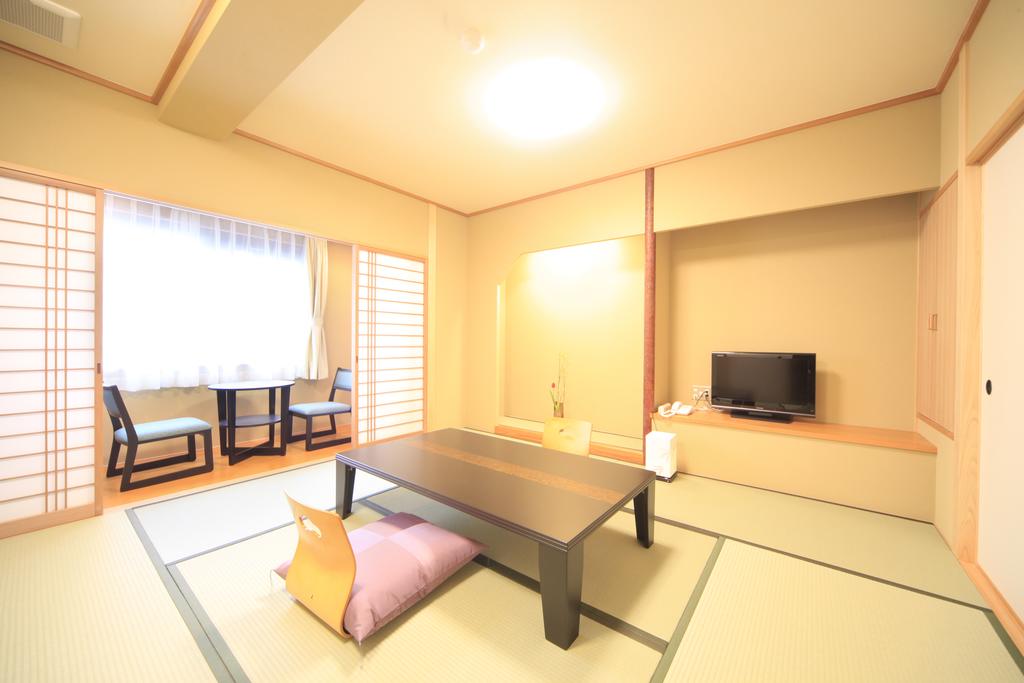 客房配有榻榻米(草编)地板和传统的蒲团寝具,设有空调、浴室用品和吹风机,还提供冰箱和电视。
