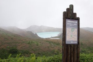 白根山是海拨2160米的活火山,火山口有个直径300米深30米的火山池,酸度极高,接近火山口处坡度平缓线条柔和,很受游客欢迎,火山口下有很大的停车场,也建有钢筋混凝土的避难小屋,以防火山突然喷发,登山道入口处有共享登山杖,还有禁飞无人机的标识,夏季多云雾,常不能登上去。